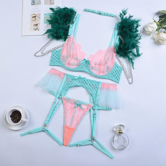 T-BOO Lingerie For Women Feather Underwear Tulle Bra With Chain See Through Lace Garter Outfits