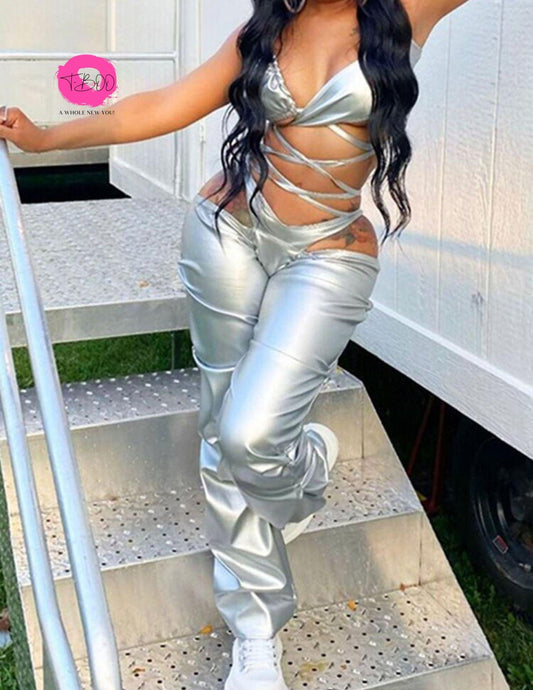 T-BOO Women 2 Pieces Set Low-Neck Solid Hollow Lace Up Corset Top+Stripe Swirl Print Pants Elastic Skinny Sporty Street Outfits- Regular price