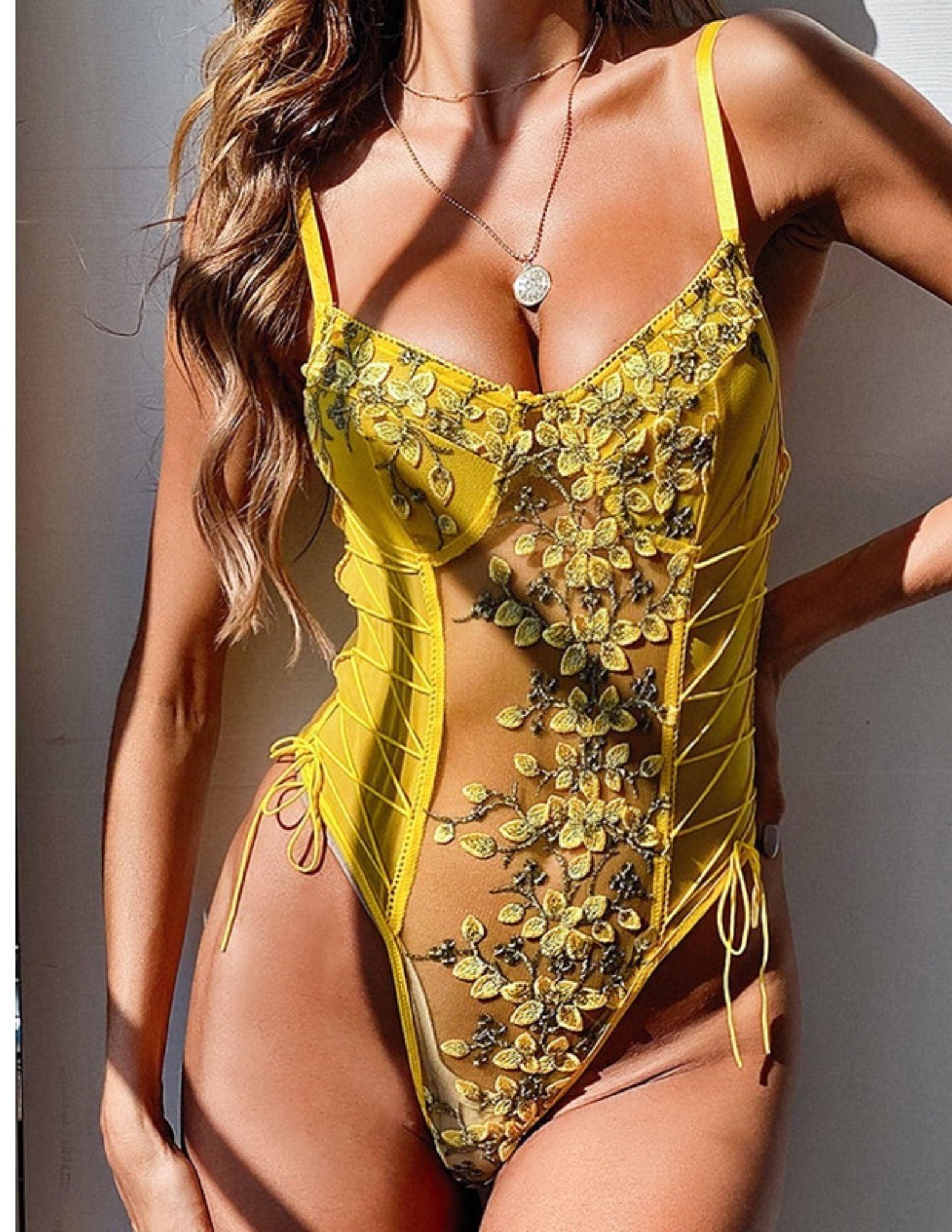T-BOO Women Bodysuit Floral Embroidery Lace Up Bandage Bodysuits Sexy Sleeveless Bodycon Transparent Mesh Lingerie