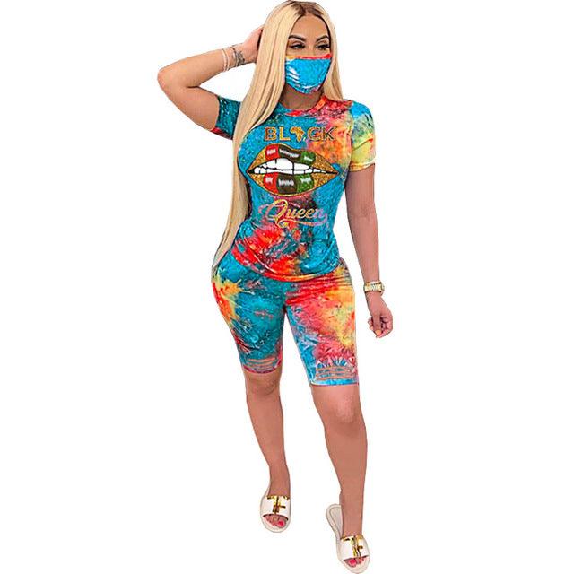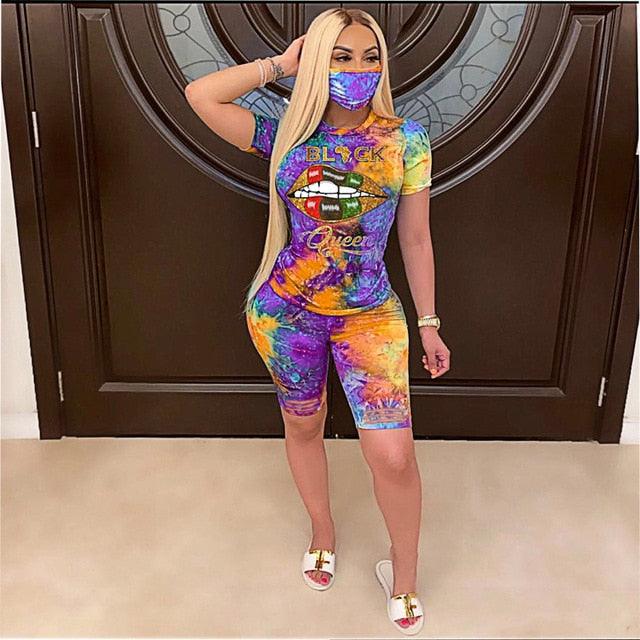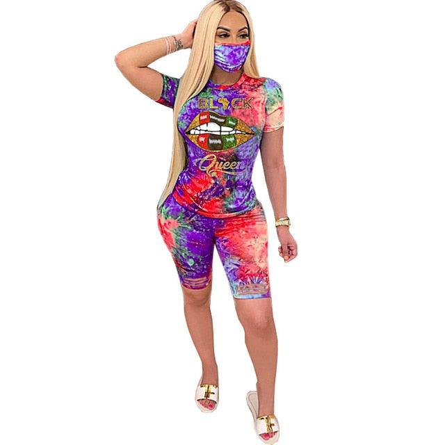 Women Summer Tie-Dye Queen Lips 2 Piece Set Casual Tracksuit Tee Tops and Matching Shorts Set